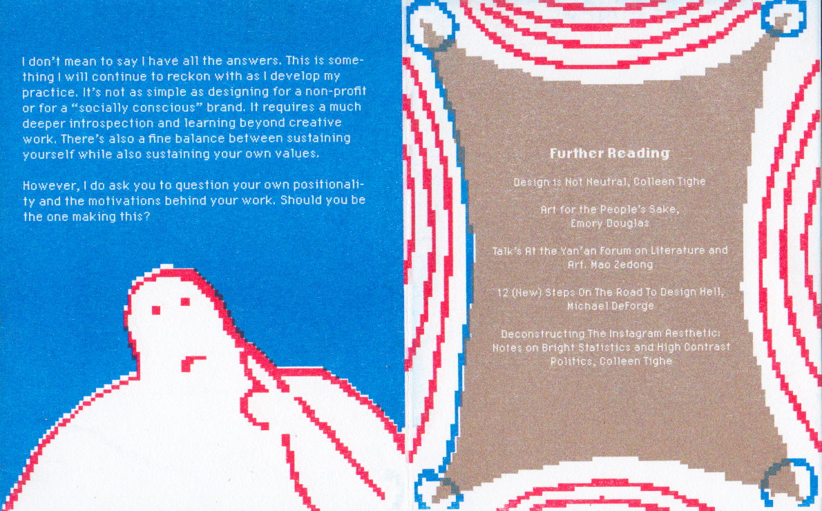 What does it actually mean to design for “good”—historically and in the present? How can we think more holistically about ourselves within and outside of our creative labor? This zine is only the beginning of a much larger question of weight of design as political action.